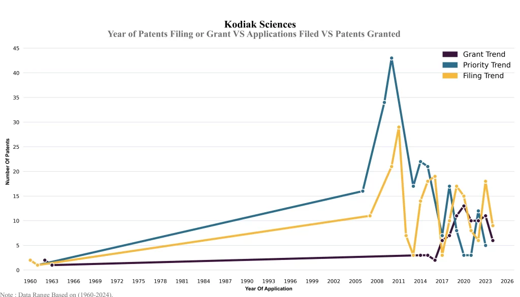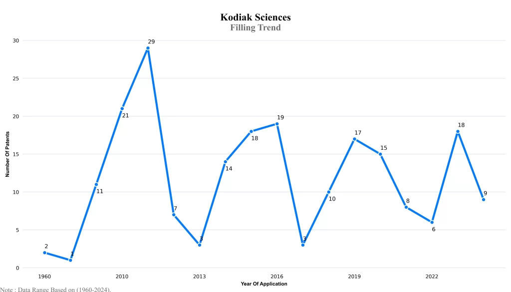 The below graphical representation indicates yearly filing trends of the Kodiak Sciences, which shows that the number of applications peaked in 2011 with 2023-2024 filings potentially still being recorded, indicating that the trend could rise further.