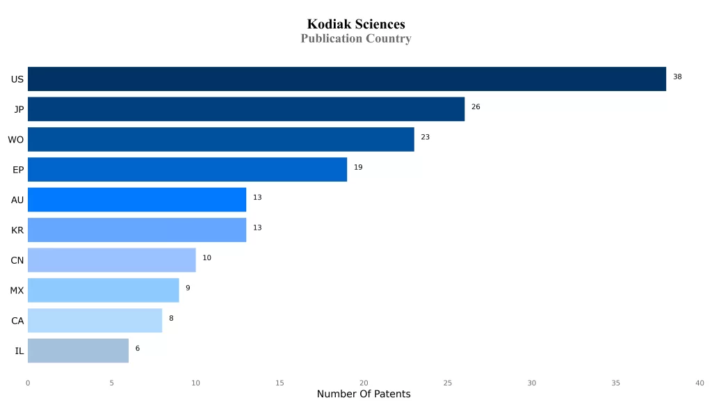 Kodiak Sciences along with its key subsidiaries has a total of around 211 patents/applications globally as of the date of the instant publication, out of which 89 patents have been issued. Of these 211 patents/applications, more than 77.73% patents/applications are active. United States is where Kodiak Sciences has filed the maximum number of patents, followed by Japan.