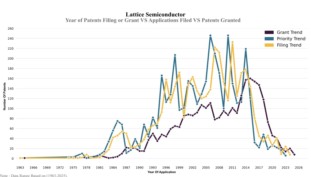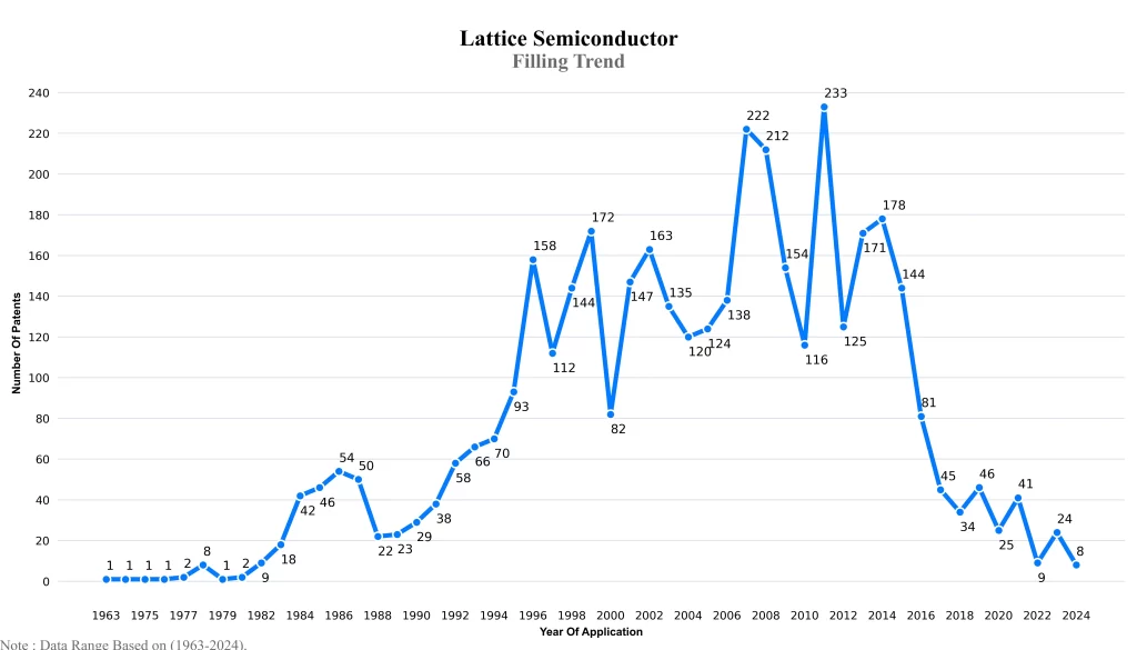 The below graphical representation indicates yearly filing trends of the Lattice Semiconductor, which shows that the number of applications peaked in 2011 with 2023-2024 filings potentially still being recorded, indicating that the trend could rise further.