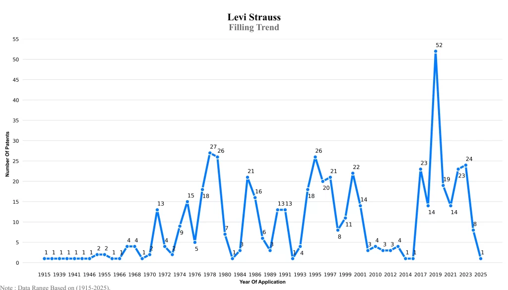 The below graphical representation indicates yearly filing trends of the Levi Strauss, which shows that the number of applications peaked in 2019 with 2023-2024 filings potentially still being recorded, indicating that the trend could rise further.