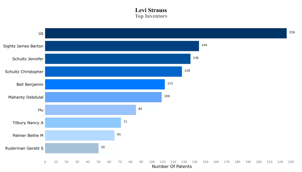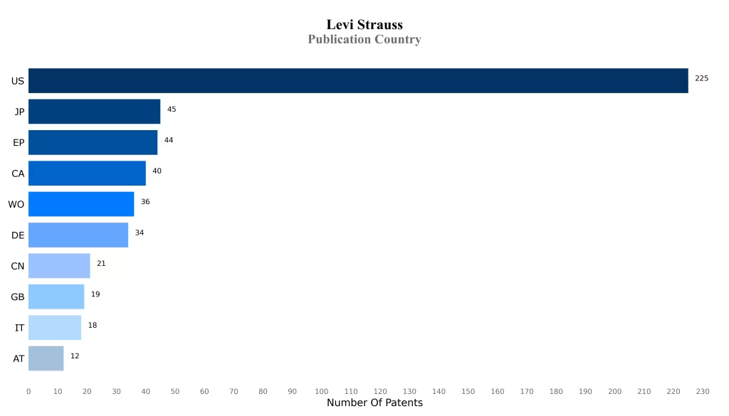 Levi Strauss along with its key subsidiaries has a total of around 574 patents/applications globally as of the date of the instant publication, out of which 100 patents have been issued. Of these 574 patents/applications, more than 22.3% patents/applications are active. United States is where Levi Strauss has filed the maximum number of patents, followed by Japan.