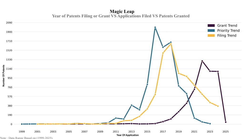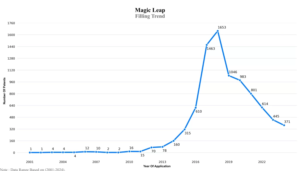 The below graphical representation indicates yearly filing trends of the Magic Leap, which shows that the number of applications peaked in 2018 with 2023-2024 filings potentially still being recorded, indicating that the trend could rise further.