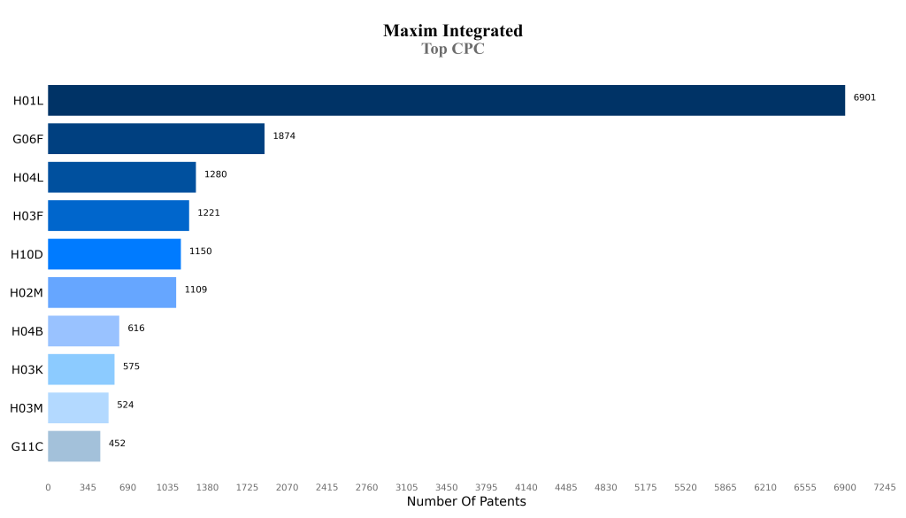 Most of the patents of the Maxim Integrated are in the classification of H01L and G06F, which indicates the core areas of technology focus of the company.