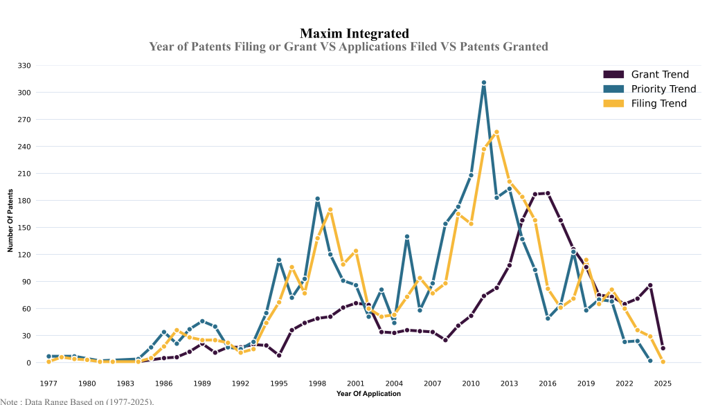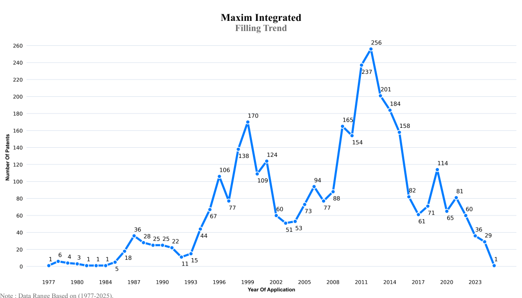 The below graphical representation indicates yearly filing trends of the Maxim Integrated, which shows that the number of applications peaked in 2012 with 2023-2024 filings potentially still being recorded, indicating that the trend could rise further.