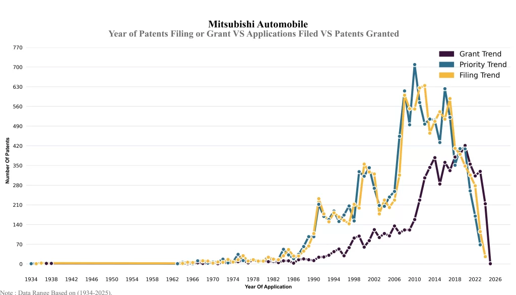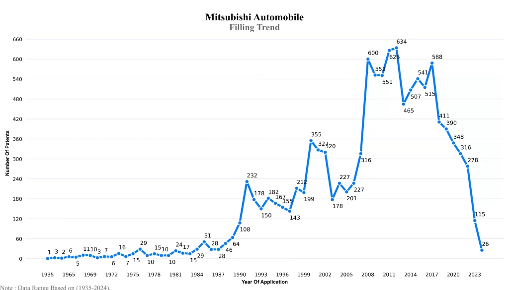 The below graphical representation indicates yearly filing trends of the Mitsubishi Automobile, which shows that the number of applications peaked in 2012 with 2023-2024 filings potentially still being recorded, indicating that the trend could rise further.