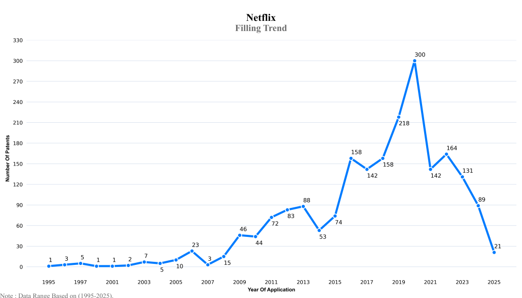 The below graphical representation indicates yearly filing trends of the Netflix, which shows that the number of applications peaked in 2020 with 2023-2024 filings potentially still being recorded, indicating that the trend could rise further.