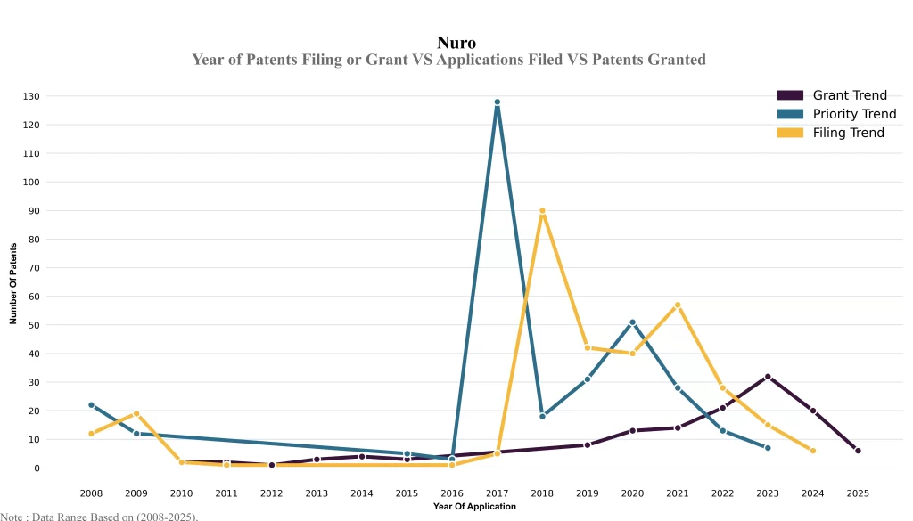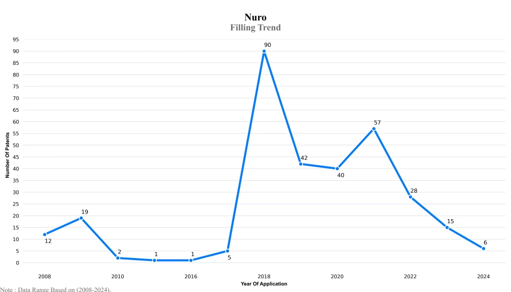 The below graphical representation indicates yearly filing trends of the Nuro, which shows that the number of applications peaked in 2018 with 2023-2024 filings potentially still being recorded, indicating that the trend could rise further.