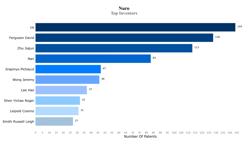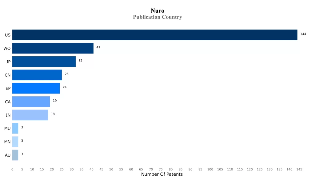 Nuro along with its key subsidiaries has a total of around 318 patents/applications globally as of the date of the instant publication, out of which 123 patents have been issued. Of these 318 patents/applications, more than 67.61% patents/applications are active. United States is where Nuro has filed the maximum number of patents, followed by World Intellectual Property Organization.