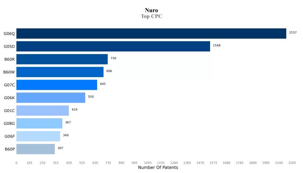 Most of the patents of the Nuro are in the classification of G06Q and G05D, which indicates the core areas of technology focus of the company.