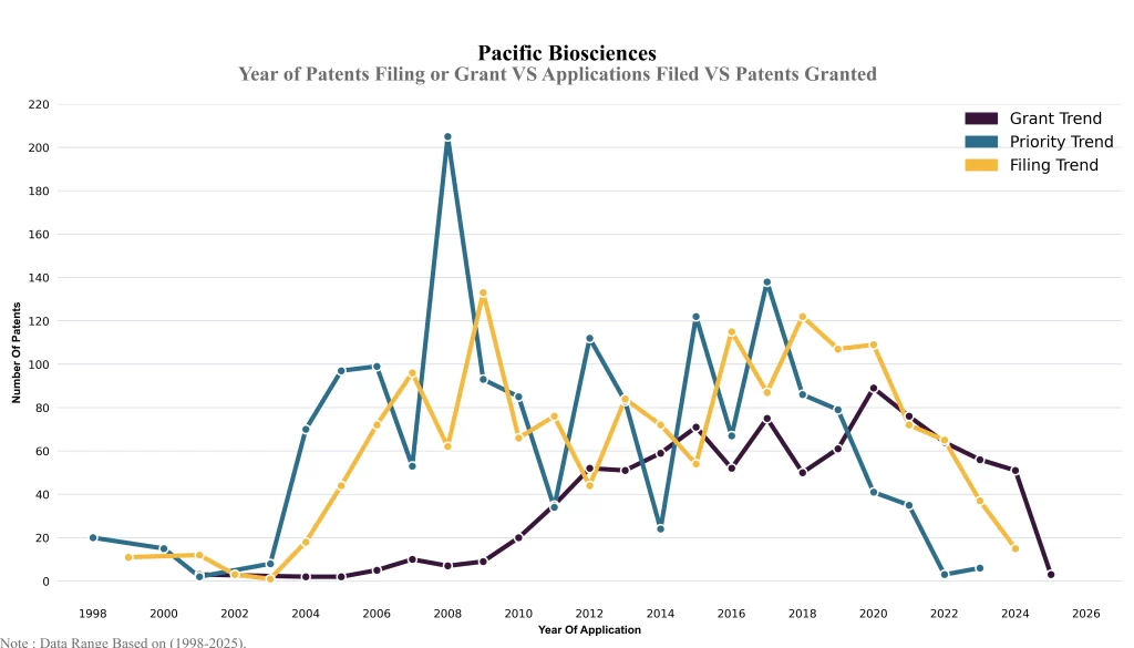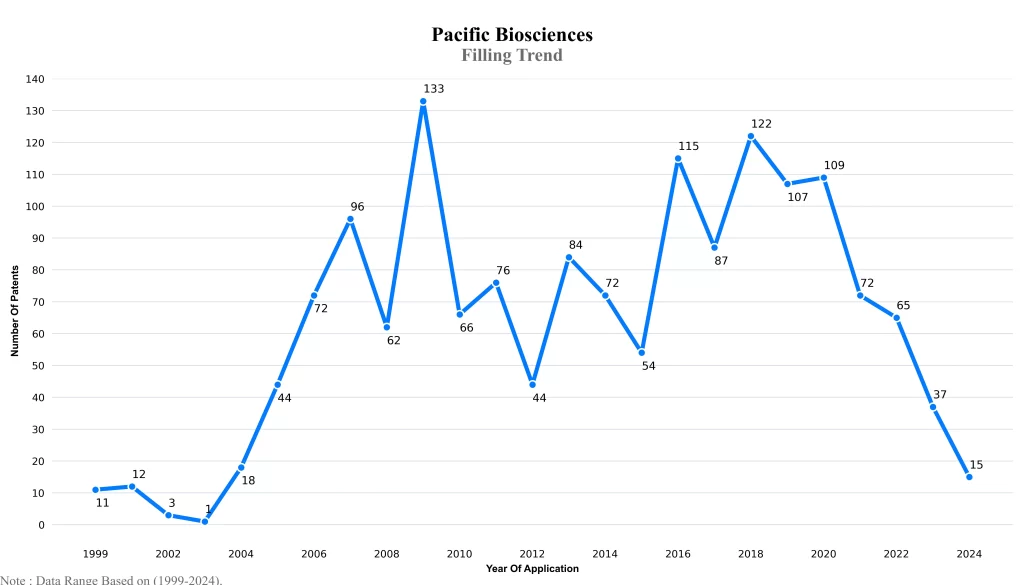 The below graphical representation indicates yearly filing trends of the Pacific Biosciences, which shows that the number of applications peaked in 2009 with 2023-2024 filings potentially still being recorded, indicating that the trend could rise further.