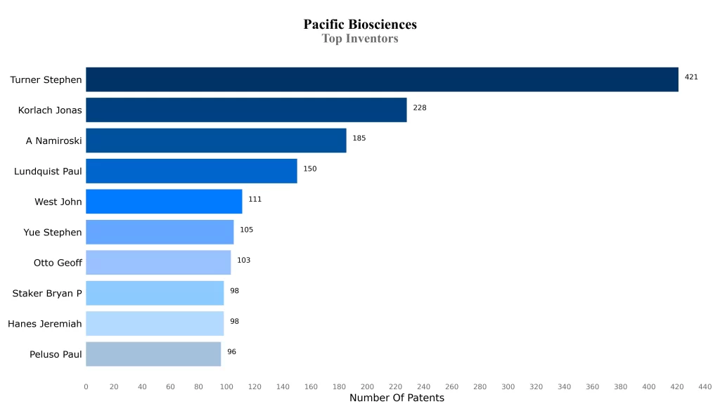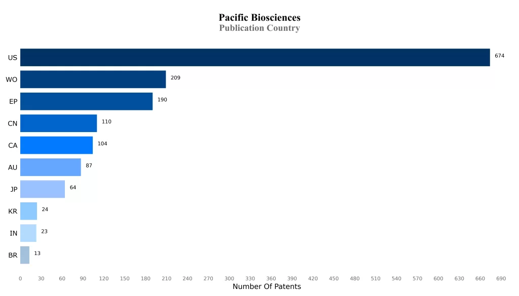 Pacific Biosciences along with its key subsidiaries has a total of around 1577 patents/applications globally as of the date of the instant publication, out of which 794 patents have been issued. Of these 1577 patents/applications, more than 64.05% patents/applications are active. United States is where Pacific Biosciences has filed the maximum number of patents, followed by World Intellectual Property Organization.