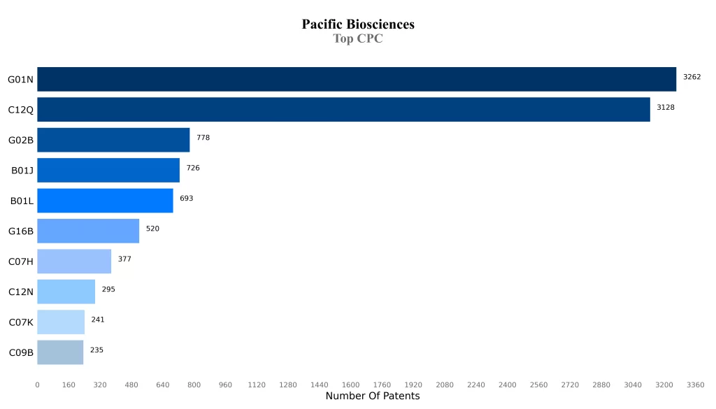 Most of the patents of the Pacific Biosciences are in the classification of G01N and C12Q, which indicates the core areas of technology focus of the company.