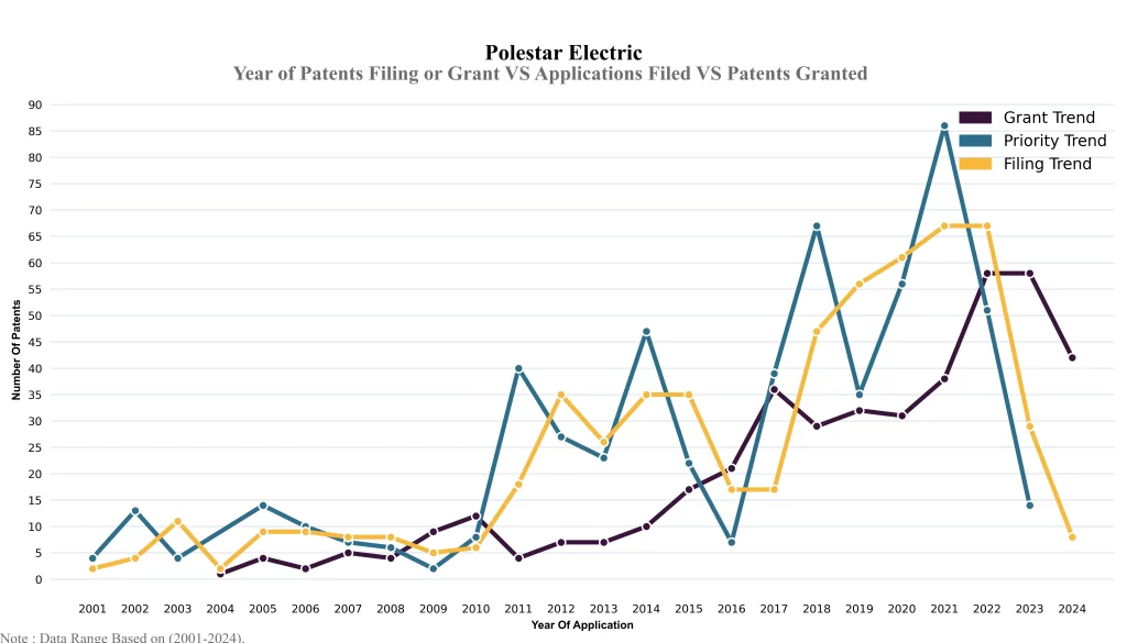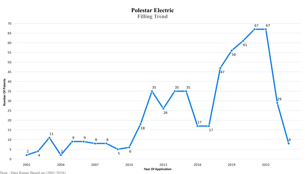 The below graphical representation indicates yearly filing trends of the Polestar Electric, which shows that the number of applications peaked in 2021 with 2023-2024 filings potentially still being recorded, indicating that the trend could rise further.