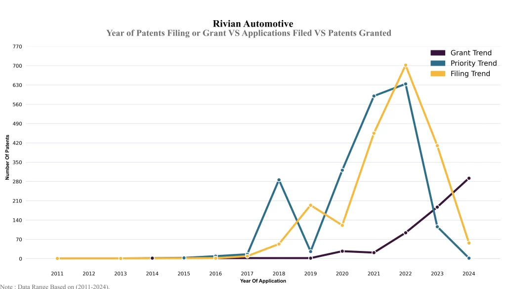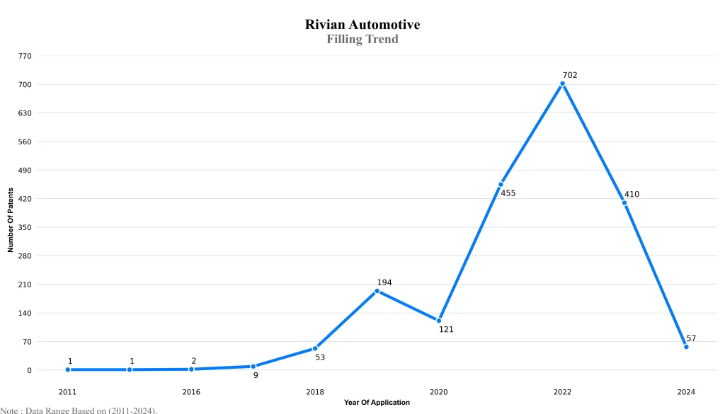 The below graphical representation indicates yearly filing trends of the Rivian Automotive, which shows that the number of applications peaked in 2022 with 2023-2024 filings potentially still being recorded, indicating that the trend could rise further.