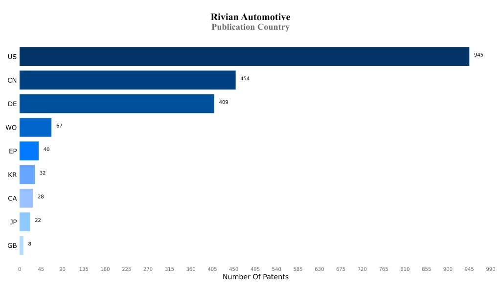 Rivian Automotive along with its key subsidiaries has a total of around 2004 patents/applications globally as of the date of the instant publication, out of which 631 patents have been issued. Of these 2004 patents/applications, more than 95.81% patents/applications are active. United States is where Rivian Automotive has filed the maximum number of patents, followed by China.