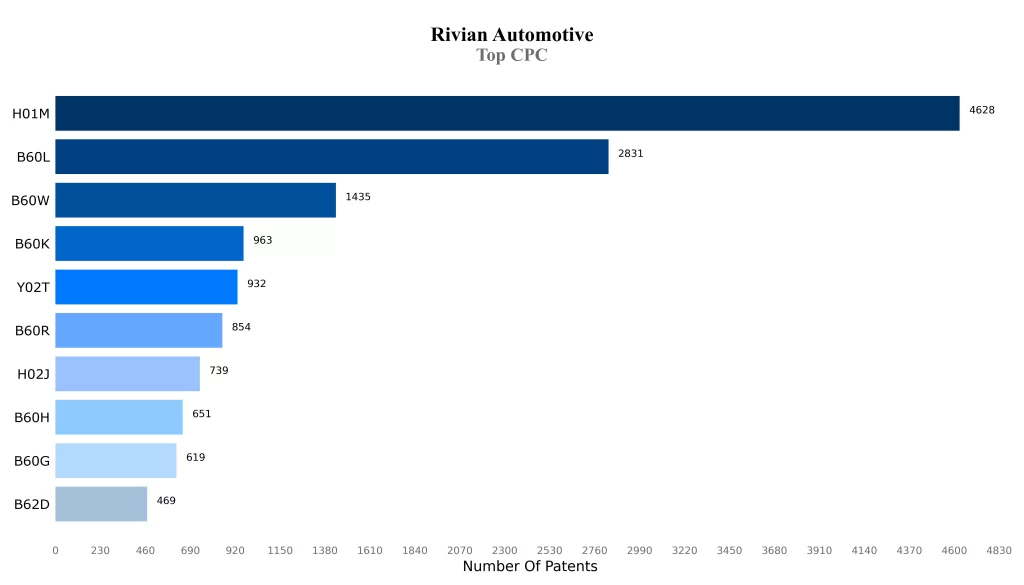 Most of the patents of the Rivian Automotive are in the classification of H01M and B60L, which indicates the core areas of technology focus of the company.