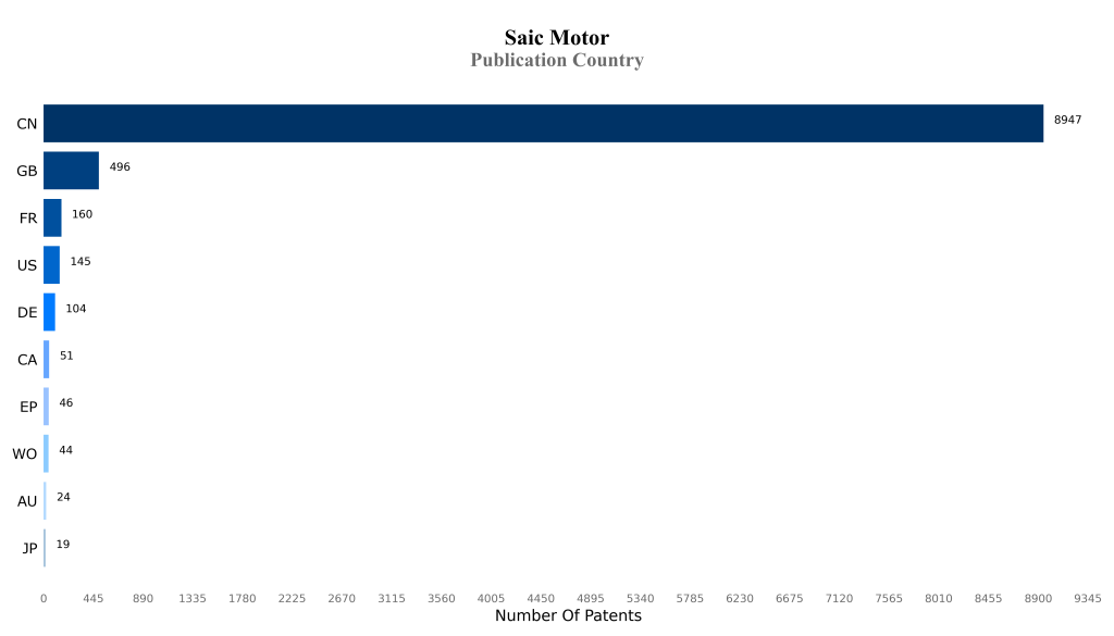 Saic Motor along with its key subsidiaries has a total of around 10146 patents/applications globally as of the date of the instant publication, out of which 3721 patents have been issued. Of these 10146 patents/applications, more than 50.96% patents/applications are active. China is where Saic Motor has filed the maximum number of patents, followed by United Kingdom.