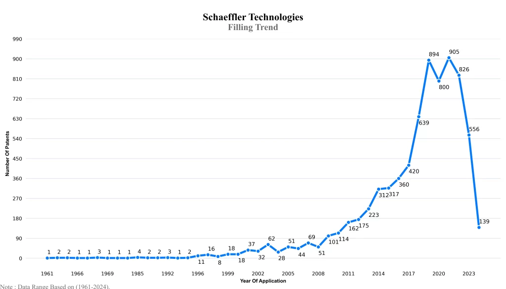 The below graphical representation indicates yearly filing trends of the Schaeffler Technologies, which shows that the number of applications peaked in 2021 with 2023-2024 filings potentially still being recorded, indicating that the trend could rise further.