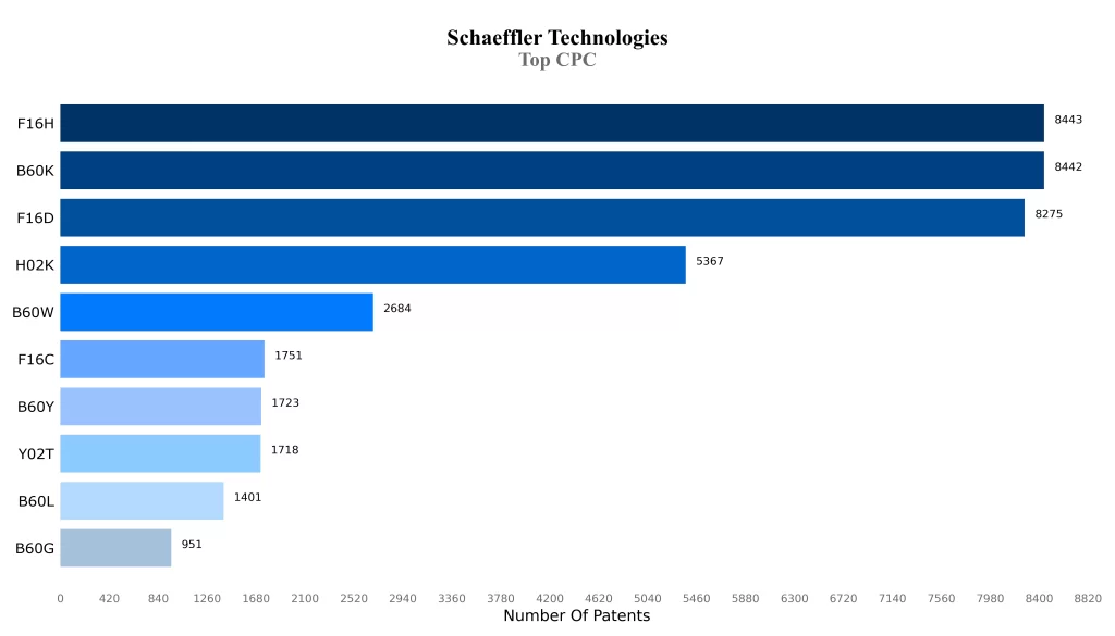 Most of the patents of the Schaeffler Technologies are in the classification of F16H and B60K, which indicates the core areas of technology focus of the company.