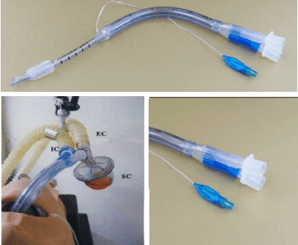 The device is designed with two distinct channels; Inspiration Channel (IC) is for passage of clean O2 enrichment air and moisture, and the Expiration Channel (EC) is for removal of CO2 enriched air and secretions in the exhaust gases collected in the Secretion Collector (SC). The two channels combine at a junction into a conventional endotracheal tube which is shorter for reduced CO2 pushed back into the lung in each cycle. The junction is placed behind the tongue.The tube then passes through the vocal cords and uses a conventional cuff to provide a seal in the trachea.
