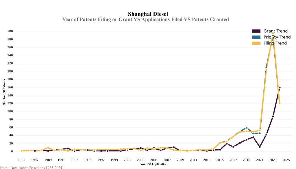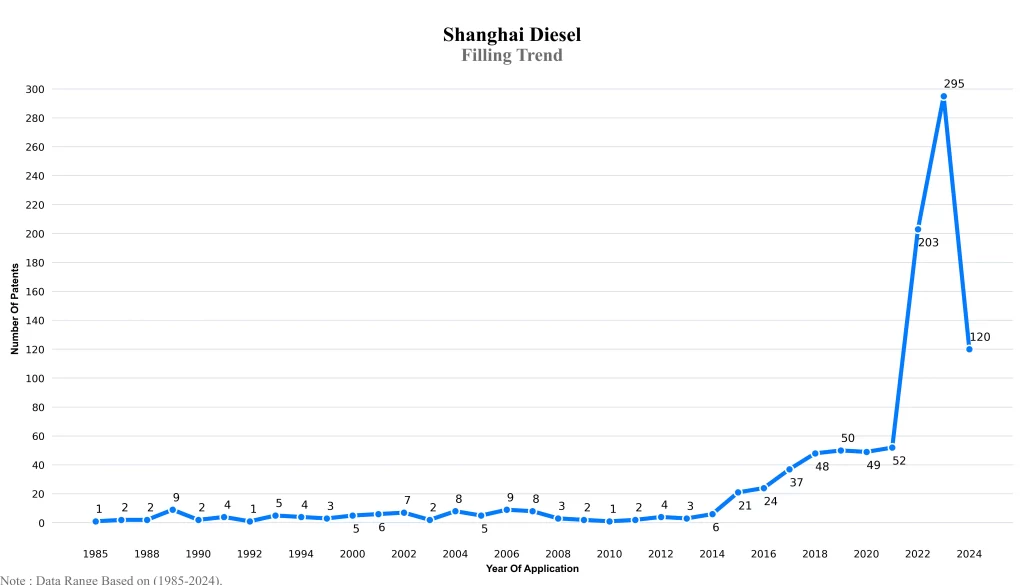 The below graphical representation indicates yearly filing trends of the Shanghai Diesel, which shows that the number of applications peaked in 2023 with 2023-2024 filings potentially still being recorded, indicating that the trend could rise further.