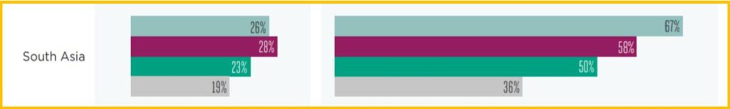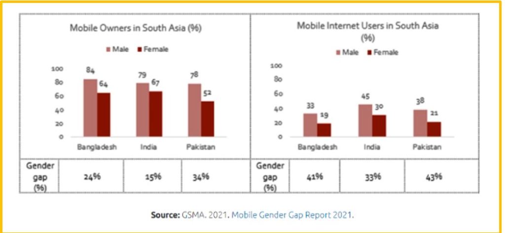 As per the Mobile Gender Gap Report 2021, in South Asia, Indian women are 15 per cent less likely to have a mobile phone than their male counterparts. They also utilise internet services 33 per cent less likely than men (as shown in Graphs 04 and 05). Although the mobile ownership gap reduced from 26 per cent to 19 per cent, and the mobile internet use gap from 67 per cent to 36 per cent, between 2017 to 2020 (as shown in Table 04), South Asia continues to have the widest mobile gender gaps globally.
