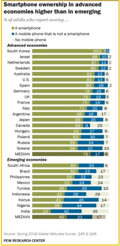 The primary reason behind the digital gap in Online Education is the disparity in access to electricity, laptops, smartphones, network connections, et al. Though laptops are favourable to completing assignments and attending online classes efficiently, smartphones are preferred by more Indian as they cannot afford laptops. A study conducted by Pew Research Center in 2018 and reported in 2019 stated that merely 24 per cent of the Indians who responded owned a smartphone while 34 per cent in toto have any phone (as shown in Table 05).[ii]