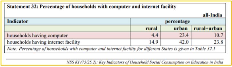 Prior to the Covid-19 scenario, as per the National Sample Survey (2017-18) merely 23.8 per cent of Indian households have access to the internet. Moreover, there was a huge rural-urban disparity when it comes to access to facilities like the internet or smartphone(s). The rural population in India is 68.84 per cent (~ 69%) as per the Census of India 2011. However, only 14.9 per cent (~ 15%) of the rural population have access to the internet as compared to 42 per cent in the urban areas.
