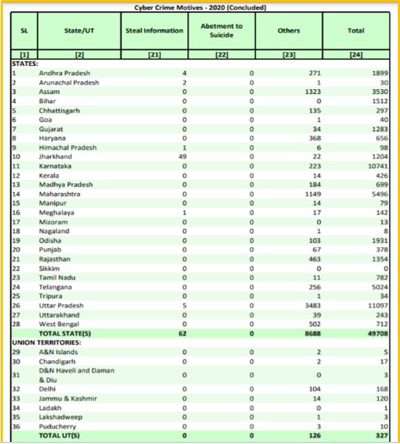 The report also mentions the motive or intent (reasons) behind the commission of cybercrime. As per the report, the majority number of the cases were of ‘Fraud’ amounting to a total of 60 per cent (i.e., 30,142 cases) cybercrime followed by Sexual Exploitation (3293 cases), Extortion (2440 cases), Disreputation (1706 cases), Personal Revenge (1470 cases) and so on committed in 2020 (as shown in Table 09).