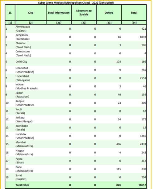 Moreover, the report mentioned cybercrimes in metropolitan cities, the number of registered cases increased by 0.89 per cent from 18,500 cases to 18,657 cases. The cybercrime rate also increased from 16.2 to 16.4 in 2020 from the previous year. Crime head-wise cases revealed that Computer Related Offences (Section 66 of IT Act) (11,356 cases) formed the highest number of Cyber Crimes accounting for 60.9% during 2020 (as shown in Table 08).