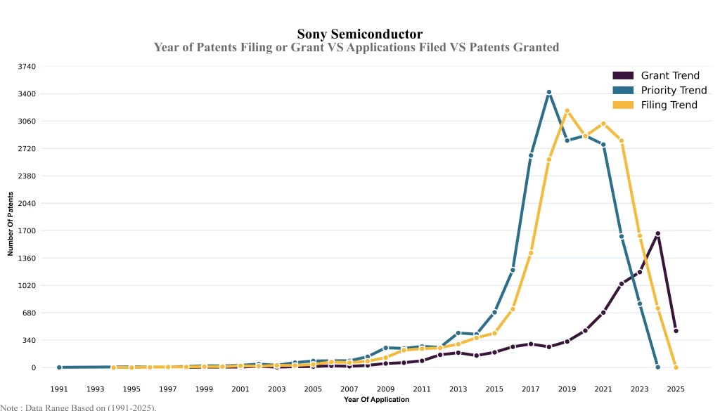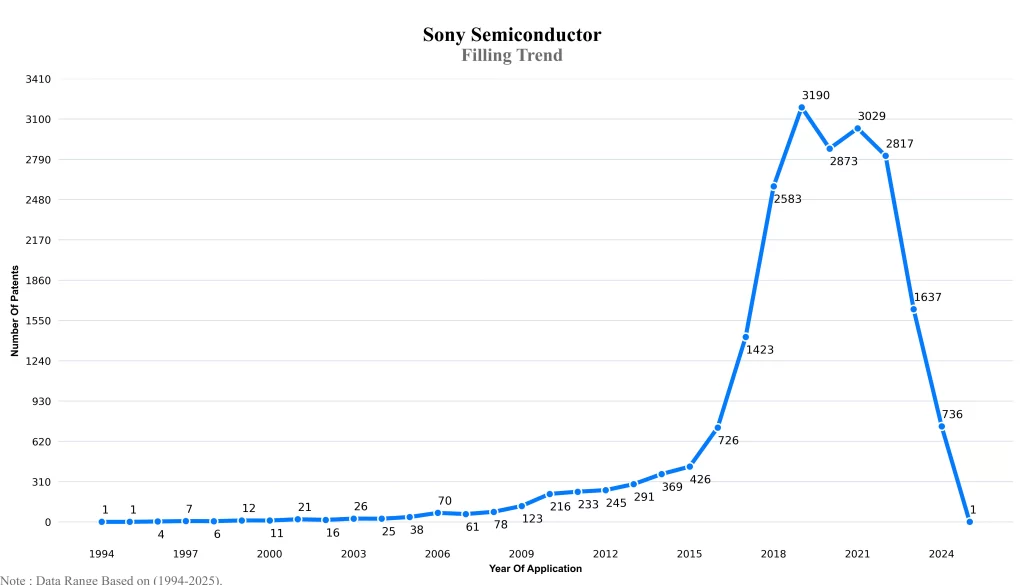 The below graphical representation indicates yearly filing trends of the Sony Semiconductor, which shows that the number of applications peaked in 2019 with 2023-2024 filings potentially still being recorded, indicating that the trend could rise further.