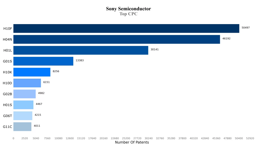 Most of the patents of the Sony Semiconductor are in the classification of H10F and H04N, which indicates the core areas of technology focus of the company.