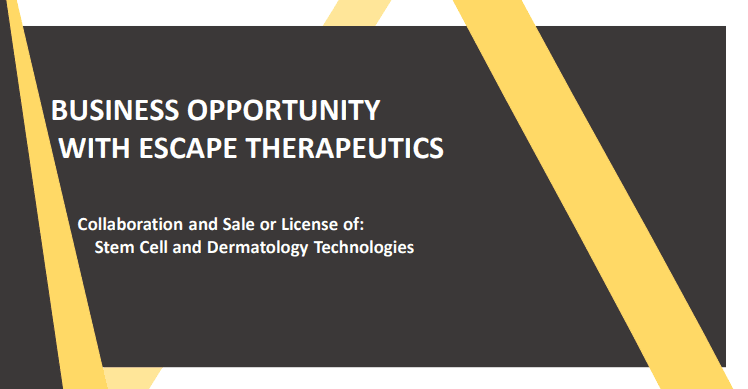 Escape Therapeutics has successfully worked on a number of novel and potentially disruptive technologies including peptides/ proteins and some of them are already in the market, either by themselves, or in collaboration, and has also out-licensed portfolios in the past. Their various technologies/ products can be applied for treating conditions such as Type I diabetes, Myocardial infarction and Chronic heart failure, Osteoarthritis, Scleroderma, thermal burn and radiation injury, Hyperpigmentation, Melanoma, Aging, Wound and scar etc. Escape Therapeutics is currently looking for licensing/sale of their Patent Portfolio (including stake in the entity as well) and/or for allied collaborations.