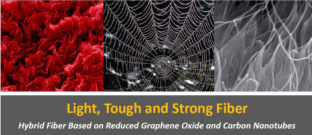 Hybrid Fiber Based on Reduced Graphene Oxide and Carbon Nanotubes. It mimics internal structure of spider silk, but is 6 times tougher than spider silk and 12 times tougher than Kevlar. It has excellent electric conductivity, and is twistable, sewable and weavable, therefore has multiple applications such as in fiber-type supercapacitor and battery, artificial muscle and exoskeleton, shielding and bullet-proof material, aeronautics etc.