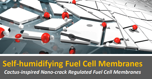 This is a cactus‐inspired nano‐crack regulated fuel cell membranes that can regulate the water content in polymeric membrane. Nano‐cracks work as nanoscale valves to retard water desorption and to maintain ion conductivity in the membrane on dehumidification. Hydrocarbon membranes coated with this material are 5 times cheaper than commercial membrane for fuel cells. These membranes have excellent PEMFC performance at high temperature and low humidity and can have diverse application including in fuel cells and reverse electro dialysis (RED).