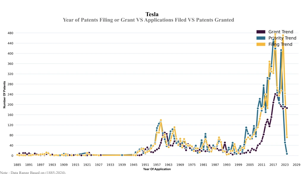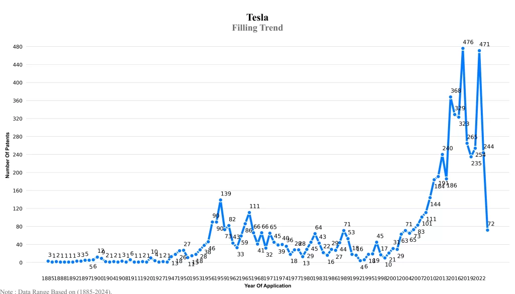 The below graphical representation indicates yearly filing trends of the Tesla, which shows that the number of applications peaked in 2018 with 2023-2024 filings potentially still being recorded, indicating that the trend could rise further.