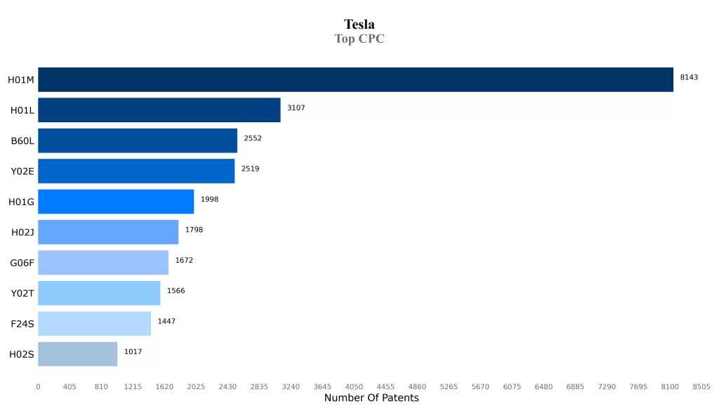 Most of the patents of the Tesla are in the classification of H01M and H01L, which indicates the core areas of technology focus of the company.