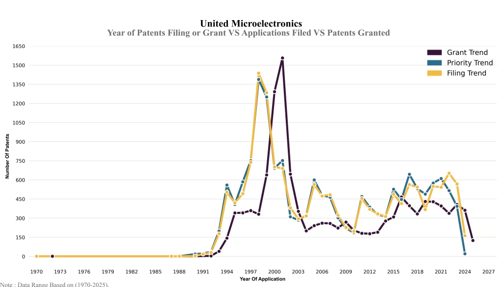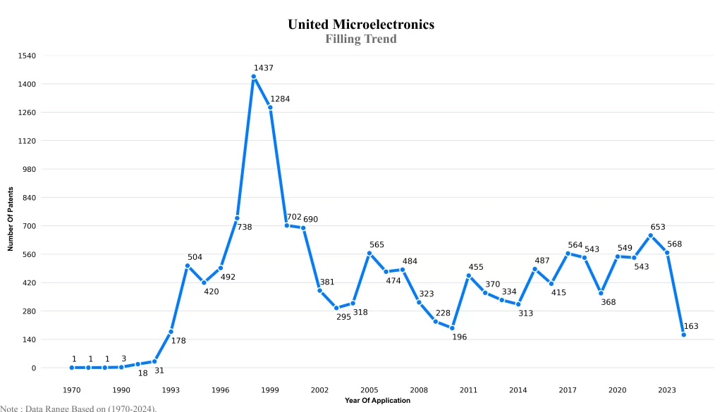 The below graphical representation indicates yearly filing trends of the United Microelectronics, which shows that the number of applications peaked in 1998 with 2023-2024 filings potentially still being recorded, indicating that the trend could rise further.