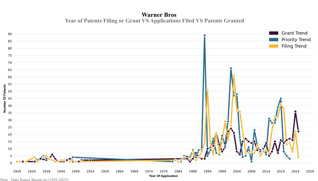 The below graphical representation indicates yearly filing trends of the Warner Bros, which shows that the number of applications peaked in 2003 with 2023-2024 filings potentially still being recorded, indicating that the trend could rise further.