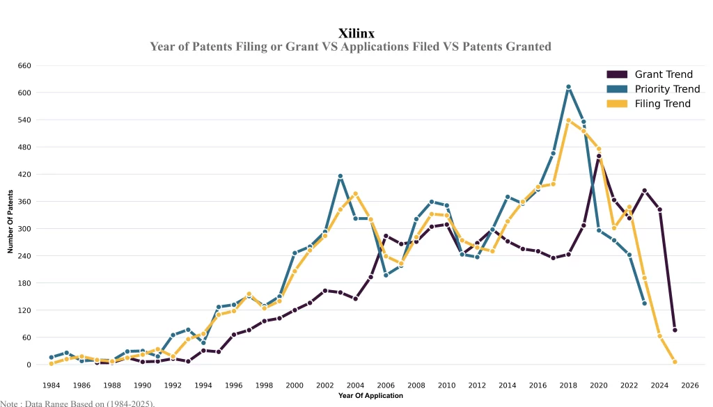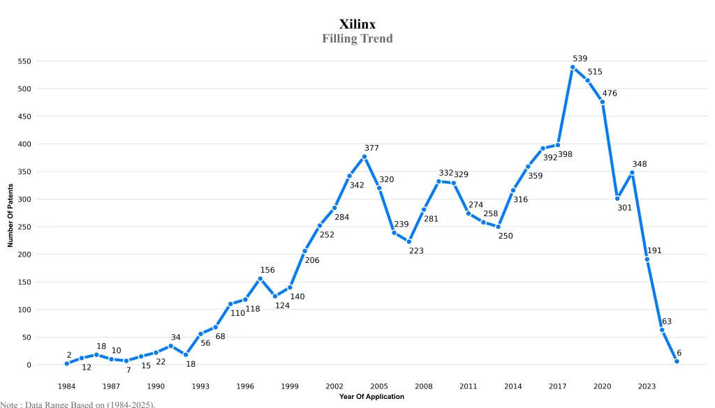 The below graphical representation indicates yearly filing trends of the Xilinx, which shows that the number of applications peaked in 2018 with 2023-2024 filings potentially still being recorded, indicating that the trend could rise further.