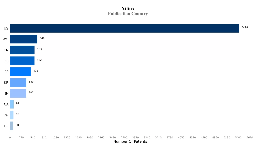 Xilinx along with its key subsidiaries has a total of around 8781 patents/applications globally as of the date of the instant publication, out of which 4931 patents have been issued. Of these 8781 patents/applications, more than 65.6% patents/applications are active. United States is where Xilinx has filed the maximum number of patents, followed by World Intellectual Property Organization.